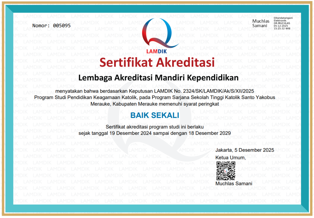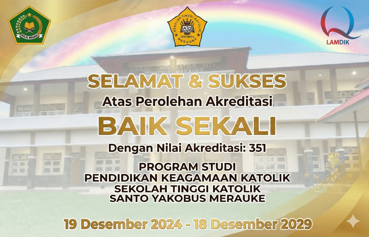 Merauke, 5 Desember 2025 – Program Studi Pendidikan Keagamaan Katolik Sekolah Tinggi Katolik Santo Yakobus Merauke berhasil meraih peringkat akreditasi Baik Sekali dari Lembaga Akreditasi Mandiri Kependidikan (LAMDIK) dengan perolehan nilai 351. Pencapaian ini ditetapkan melalui Keputusan LAMDIK Nomor 2324/SK/LAMDIK/Ak/S/XII/2025 yang ditandatangani oleh Ketua Umum LAMDIK, Muchlas Samani.